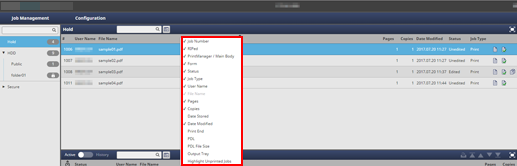 supplementary explanationWhen you select the Highlight Unprinted Jobs check box, the characters of the jobs listed as Unprinted under Print End are displayed in blue in the Hold Job list, the Secure Job list, and the HDD Job list.