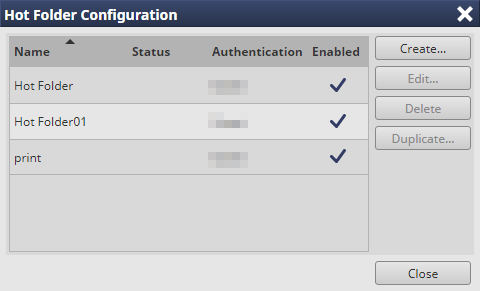 Status | Displays the editing status of the hot folder. Editing: The job is being edited using AccurioPro Print Manager or PageScope Web Connection. Processing: Data saving is in progress. |
