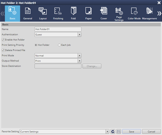 supplementary explanationIn Print Setting Priority, specify whether to give priority to the job settings assigned to the original or the print settings of the hot folder. However, even when Each Job is selected, Print Mode and Output Method are determined based on the print settings of the hot folder.