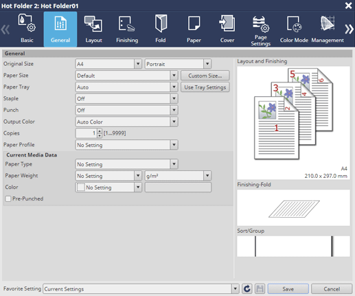 The setting items on this screen are the same as for the General screen of the Job Settings screen, excluding Printing Pages. For details about the description of the common setting items, refer to General Screen.