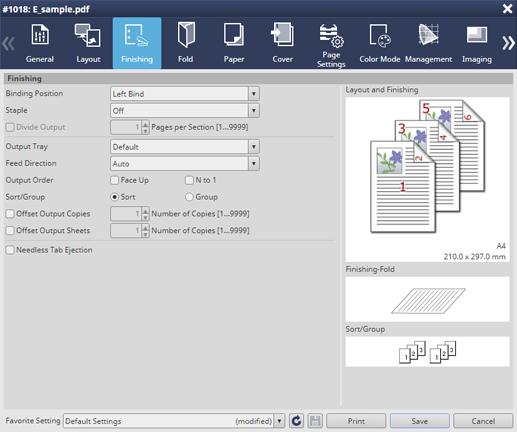 The setting items here are the same as those of the Finishing tab of the PS Plug-in driver. For details about the description of the common setting items, refer to Finishing Screen.