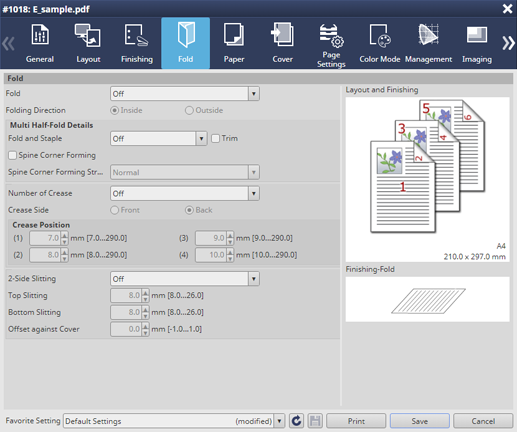 The setting items here are the same as those of the Fold tab of the PS Plug-in driver. For details about the description of the common setting items, refer to Fold Screen.