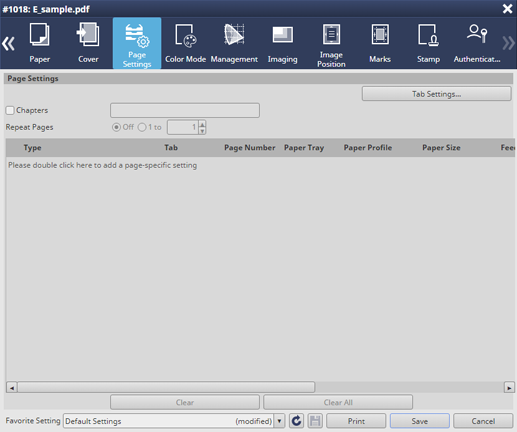 The setting items here are the same as those on the Page Settings screen of the PS Plug-in driver except the Tab Settings. For details about the description of the common setting items, refer to Page Settings Screen.