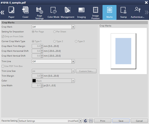 For details about the description of the setting items, refer to Marks (Crop Marks) screen.