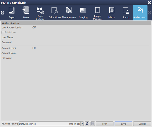 On the Authentication screen of the PS Plug-in driver, you need to enter the setting information of either the user authentication or the account track or both of them. However, in AccurioPro Print Manager, configuration information is automatically displayed, so you do not need to enter it. For details about the description of the setting items, refer to Authentication Screen.