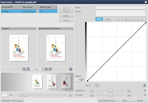 You can adjust the tone curve per job for the hold jobs. This is a convenient function when reprinting the job after adjusting the tone curve only. Also, you can adjust tone curves for each page (Page Tone Curve).