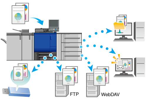 When you are using AccurioPress C3080, AccurioPress C3070, or AccurioPrint C3070L, you can send an E-mail with scanned-data attached, send data to the shared computer (SMB server), FTP server, or WebDAV server, and save data in the USB flash drive mounted on the machine.