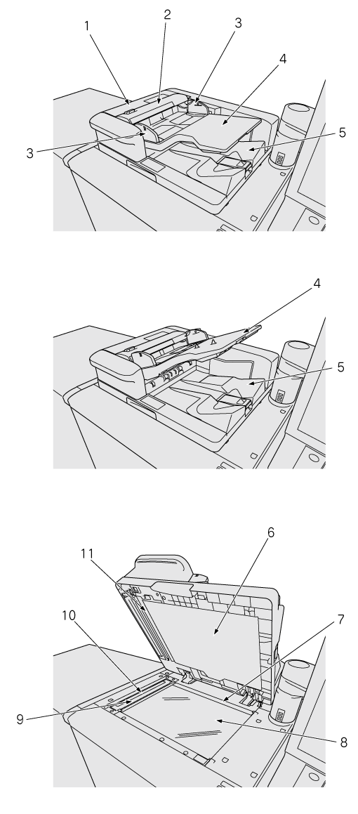 11 | Slit scan glass for back side | Scans original images in the back side on this part when using ADF. |