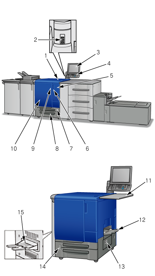 14 | Waste toner box replacement door | Opens to allow replacement of the waste toner box. |