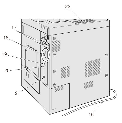 21 | Network port (10Base-T, 100Base-TX, 1000Base-T) | Connected with an Ethernet cable to operate the machine, or to use the machine as a network printer/scanner. |