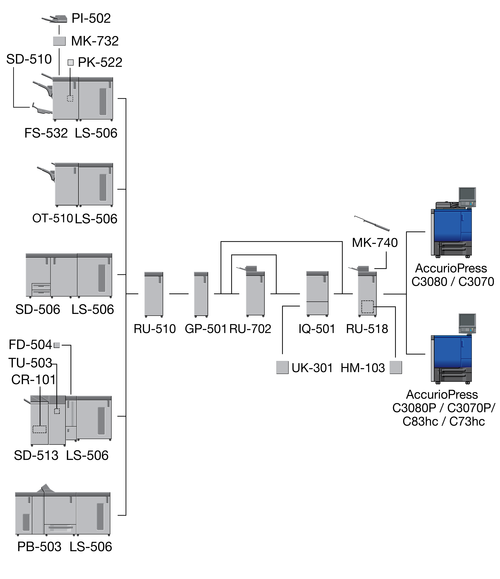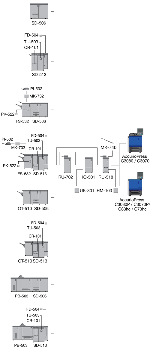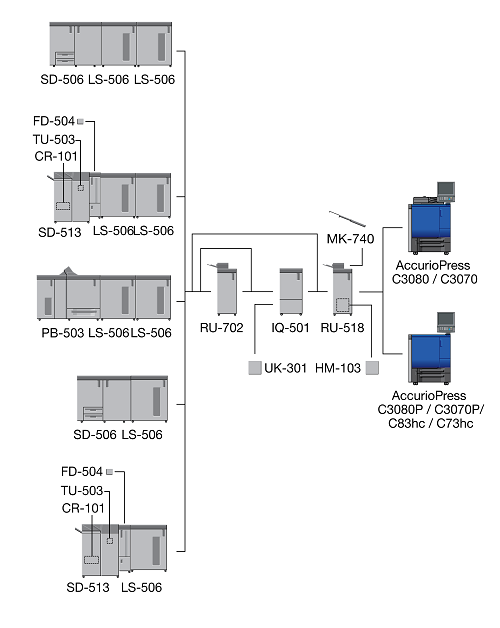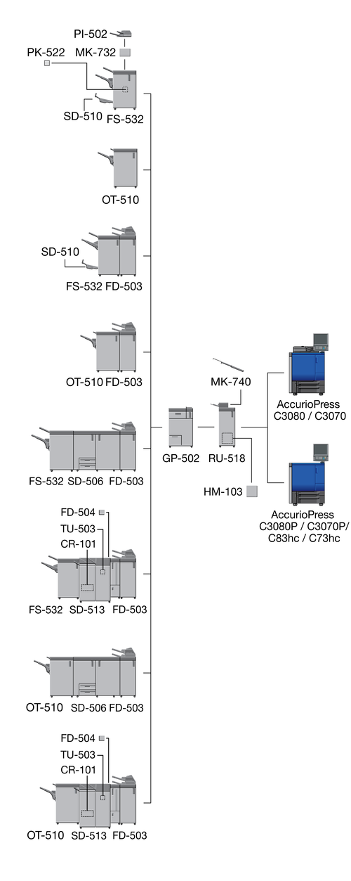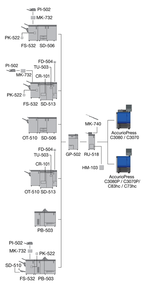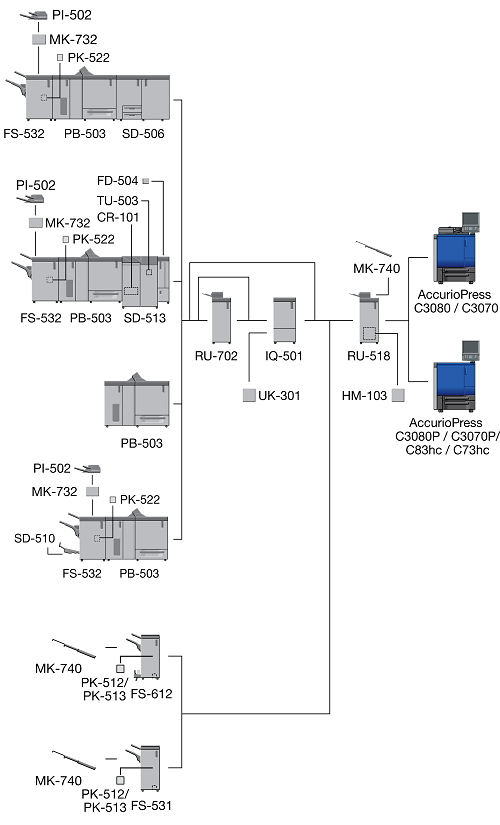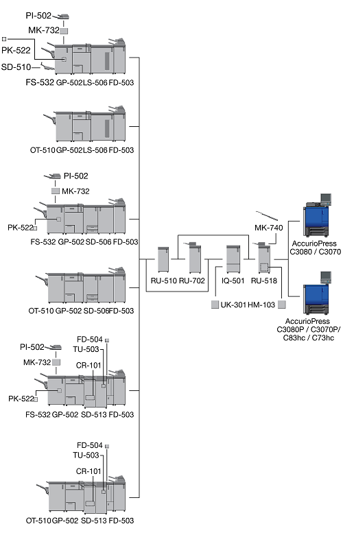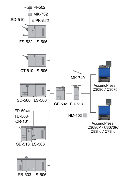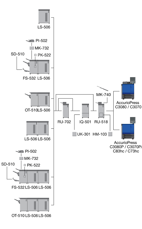 When the Finisher FS-532 equipped with the Post Inserter PI-502 is installed immediately after the Relay Unit RU-518, the sub tray or the output extension tray of the Banner Tray Unit MK-740 cannot be mounted to the Relay Unit RU-518.