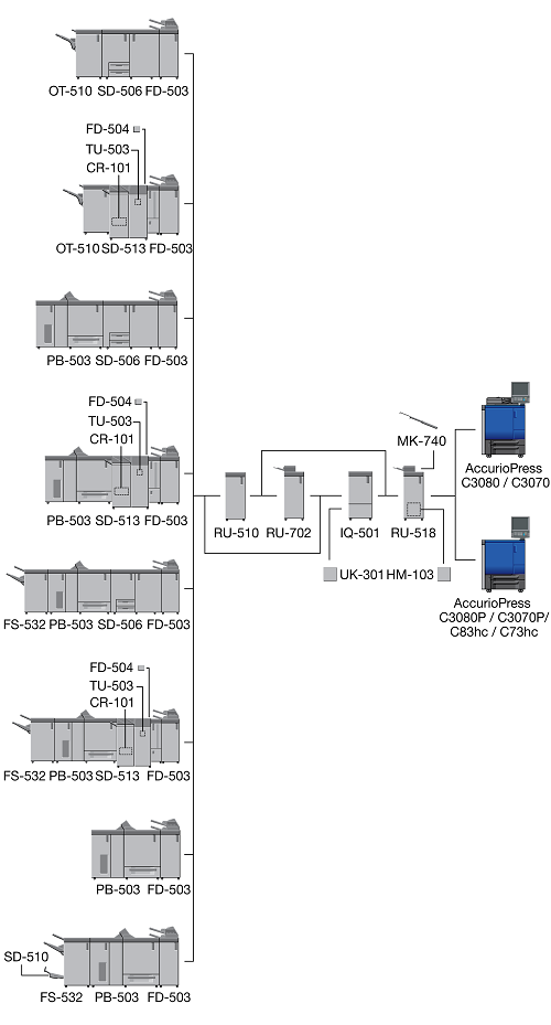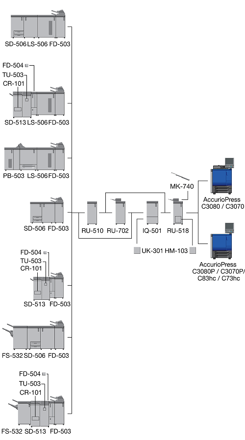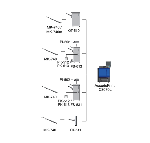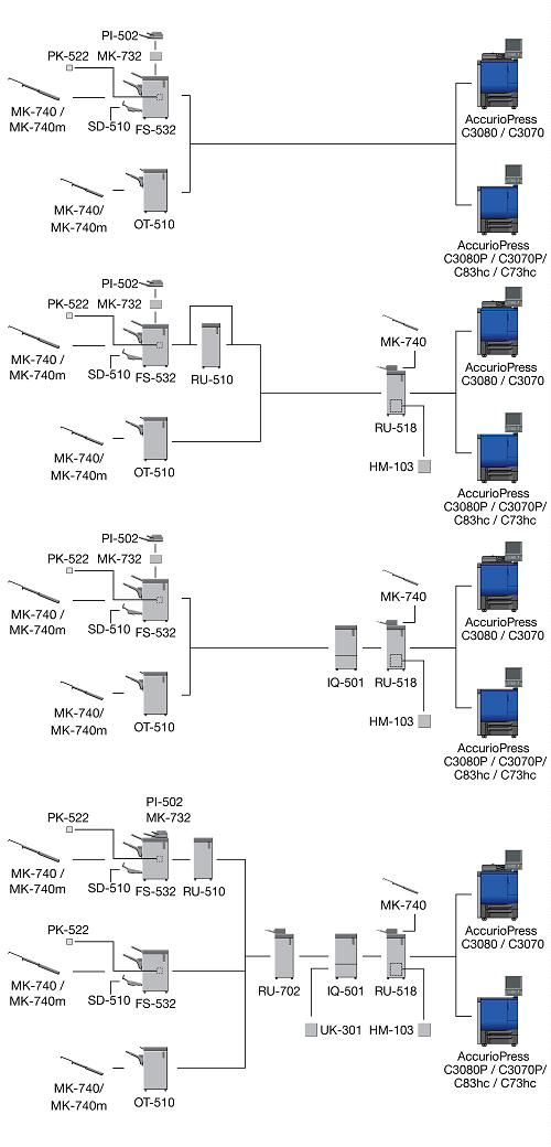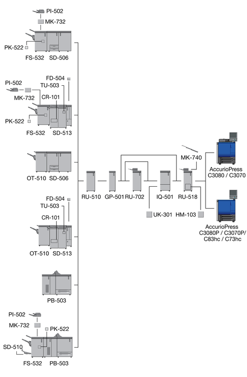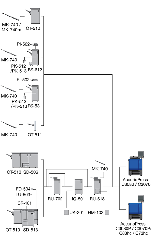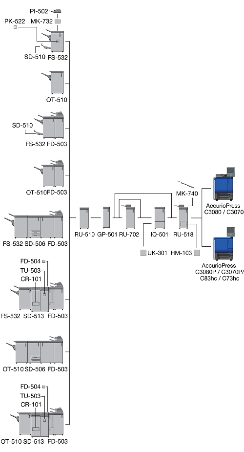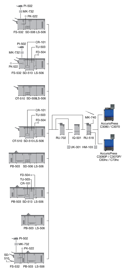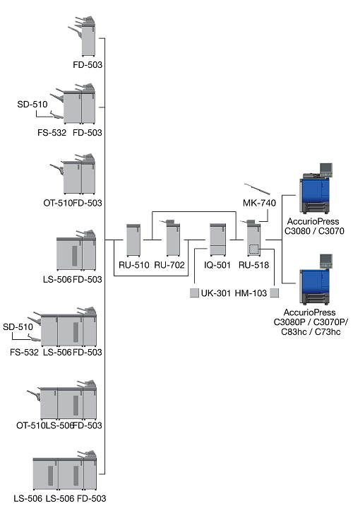 When the Finisher FS-532 equipped with the Post Inserter PI-502 is installed immediately after the Relay Unit RU-518, the sub tray or the output extension tray of the Banner Tray Unit MK-740 cannot be mounted to the Relay Unit RU-518.