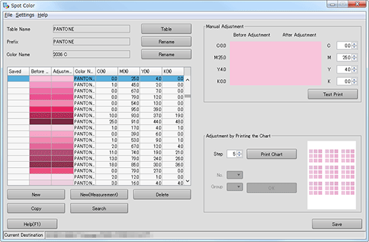You can adjust the CMYK values of the spot color on Spot Color screen. The adjustment result is reflected in the preview in a timely manner. The colors before and after adjustment can be printed for comparison.