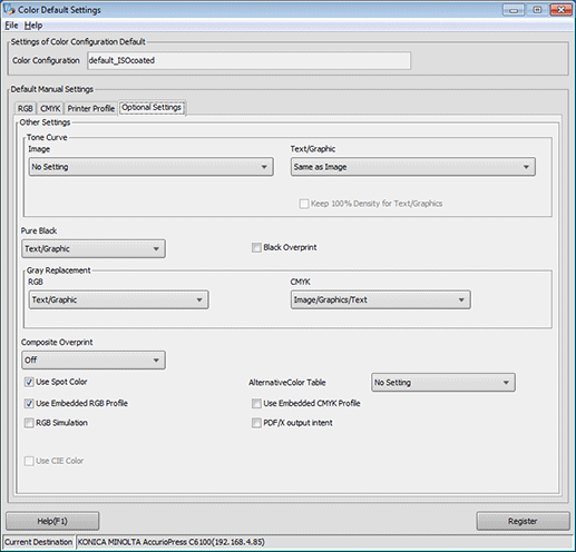 When the Printer Profile tab is selected, the Color Default Settings screen is displayed as shown below.