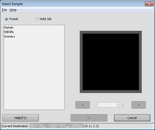 According to the selection of Preset/Hold Job, displays a list of preset images or a list of hold jobs (file name and registration date/time) in the image controller which is connected currently.