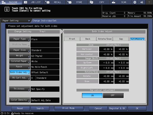 On the MACHINE screen, press Adjustment - Quality Adj. - Periodical Both Sides Adj. in sequence, and set Period. Both Sides Auto Adj. to ON. You can then set Periodical Adjustment to ON or OFF. For the tray set to ON, Periodical Adjustment is available. For details, refer to Periodical Both Sides Adj..