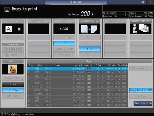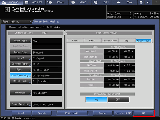 Both sides of an adjustment chart output from Print Mode are scanned using Intelligent Quality Optimizer IQ-501, and the both side adjustment is performed automatically. After adjustment, each adjustment value (Zoom / Image Shift / Rotate/Skew) of this screen is updated.