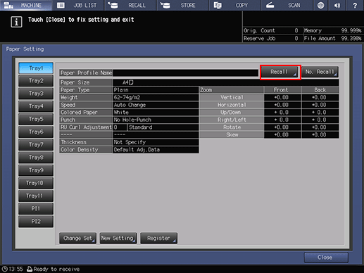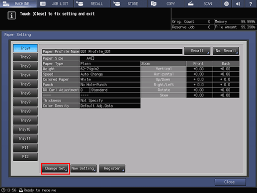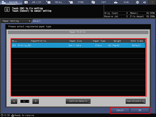 Select a paper profile of the paper brand (paper profile name), Paper Size, Paper Type, and Weight, which are the same as for the paper to be adjusted, then press OK.