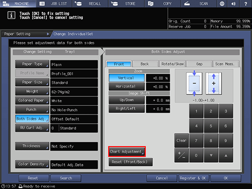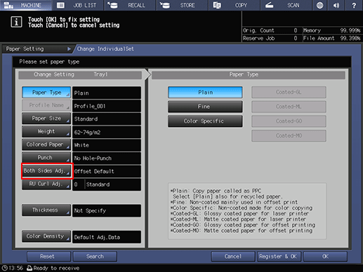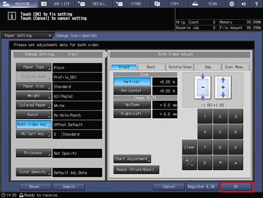 When the front side adjustment is performed for paper of a new brand, weight, or size, press Register & OK, then proceed to the next step.