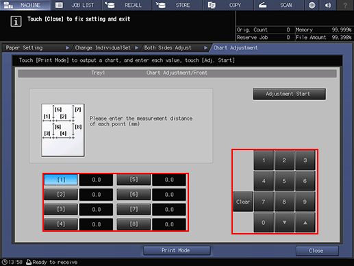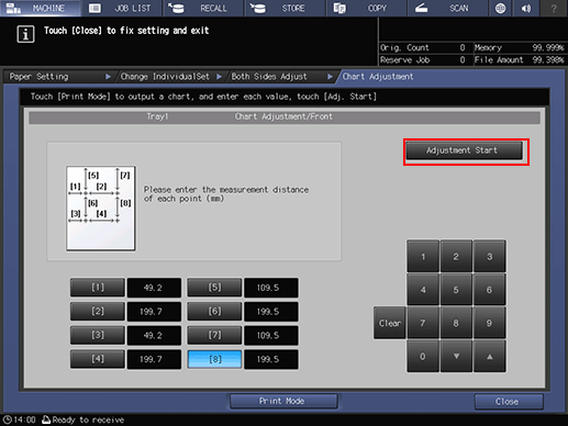 Output the front side adjustment chart again, then check the lengths at points [2], [4], [6], and [8] on the second and third output charts.