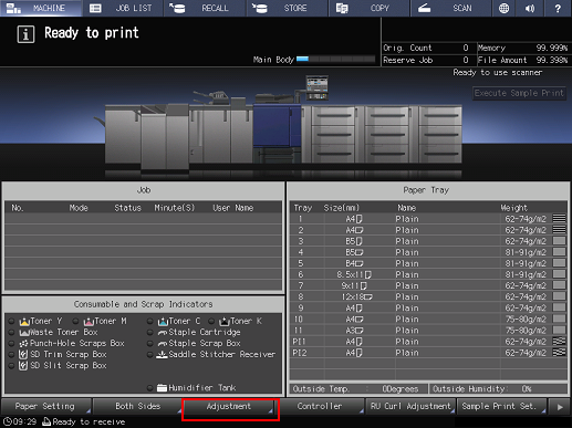 1. On the touch panel of the main body, press Adjustment on the MACHINE screen.