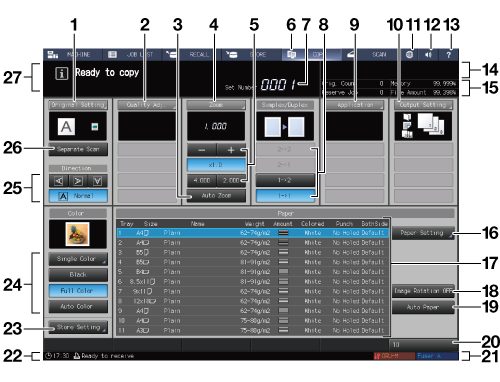 The COPY screen is displayed when you make a copy. This screen allows you to select the desired copy conditions, print, and reserve jobs.