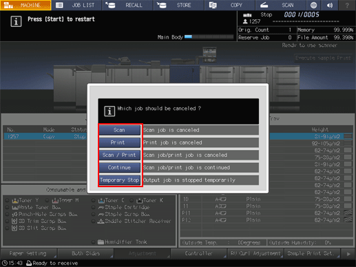 • supplementary explanationPress Temporary Stop to temporarily suspend the printing job. Press Start on the control panel to resume the printing job. When printing is suspended, some options of Paper Setting can be changed.