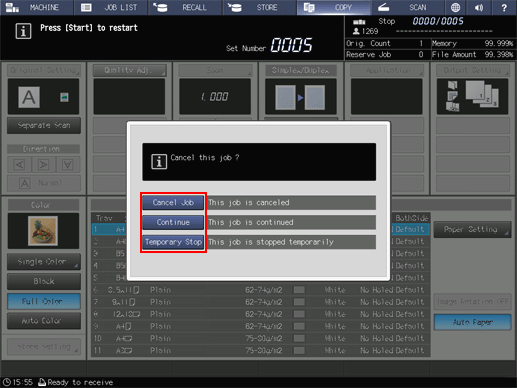 supplementary explanationPress Temporary Stop to suspend the job. When the job is suspended, some settings can be changed. Press Start on the control panel to resume the job.