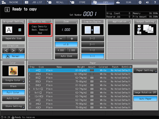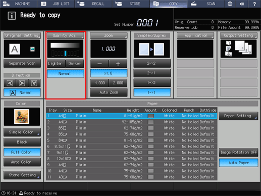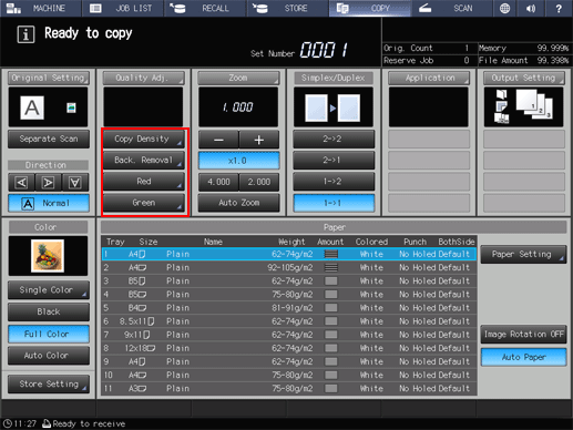 Up to 4 shortcut keys for frequently-used adjustment items can be displayed under Quality Adj. on the COPY screen. These keys allow you to directly jump to the adjustment screen for each. The setting of shortcut keys can be made from User Setting in the Utility menu.