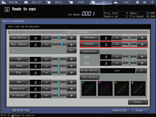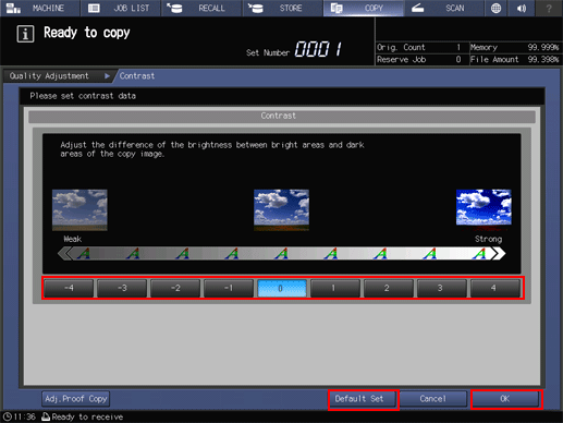 After making the desired adjustment, press Adj.Proof Copy on the Quality Adjustment screen, Adj.Proof Copy on the Contrast screen, or Proof Copy on the control panel. Check the adjustment result with output image.