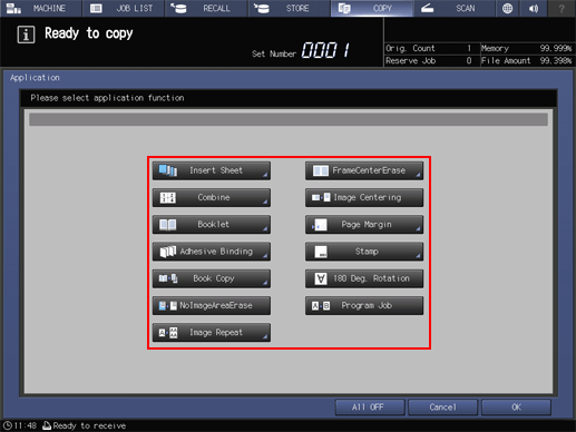 To resume the previous copy conditions, press Cancel. Press All OFF to clear all the application selections with the setting made for each saved. To resume the default setting for all copying features including Output Setting, press Reset on the control panel.