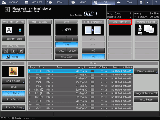 When copying using an Application Setting, select the desired functions on the Application screen.