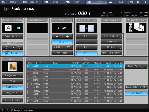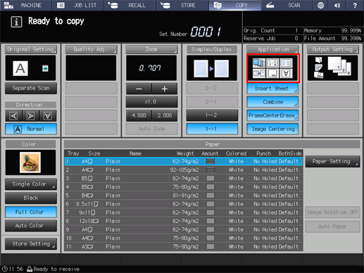 Up to 4 shortcut keys for frequently-used application settings can be displayed under Application on the COPY screen. These keys allow you to set the application function at a single touch, or to directly jump to the setting screen for each. The setting of shortcut keys can be made from User Setting in UTILITY.