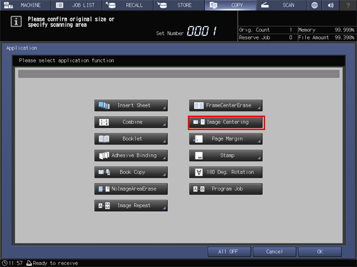 The Image Centering and No Image Area Erase icons and shortcut keys are displayed under Application on the COPY screen.