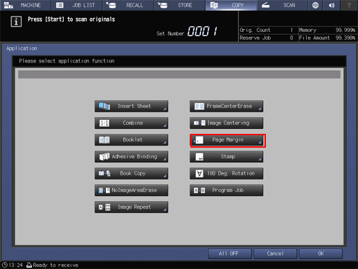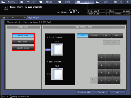 supplementary explanationTo resume the original settings, press Cancel. To cancel the Page Margin function with the current setting saved, press Function OFF.