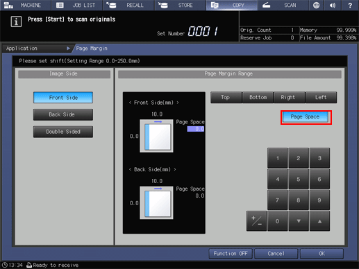 supplementary explanationThe Page Space key appears clear on the screen only when Booklet or 2 Repeat mode of Image Repeat has already been selected.