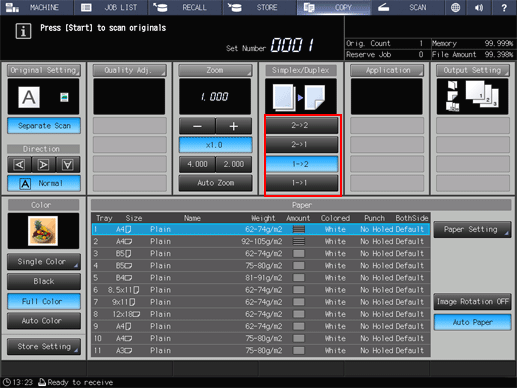 Display the COPY screen and press the desired button under Simplex/Duplex.