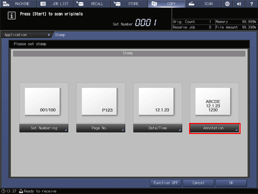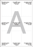 Annotation | This function allows you to recall a predefined combination of text, date/time to load the original, and annotation number of the original and to print them onto output copies at the designated location. | |