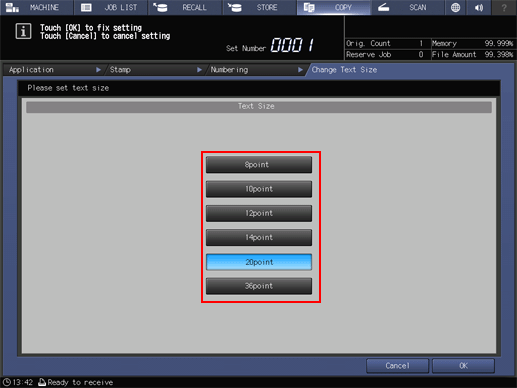 Press Change Text Size on the Numbering screen to display the Text Size screen.