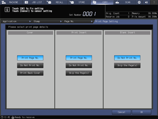 Press Print Page Setting on the Page No. screen to display Print Page Setting screen.