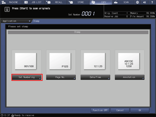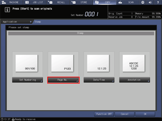 The annotation number is counted for each scanned original in scanning order. The count will continue to the next job even if the machine power is turned off then on. However, the serial count is suspended if this function is not selected or Temp.No.Set is specified.