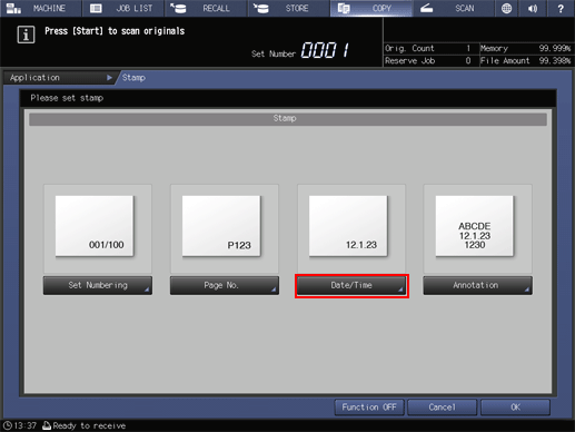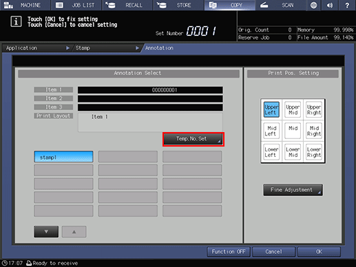 This function allows you to recall a predefined combination of text, date/time to load the original, and annotation number of the original and to print them onto output copies at the designated location. The annotation number can be changed temporarily on the Annotation screen after recalling the predefined setting (Temp.No.Set).