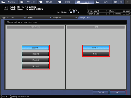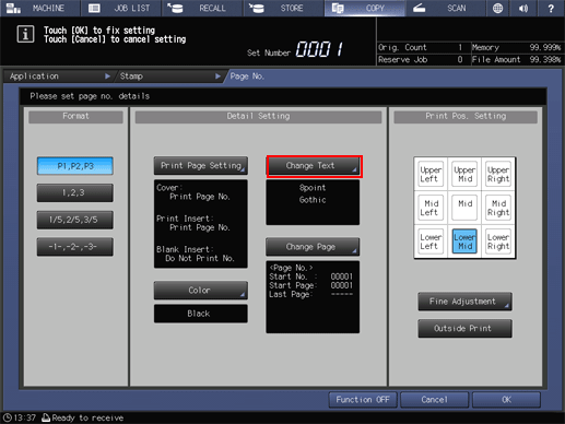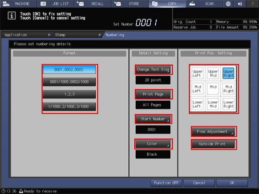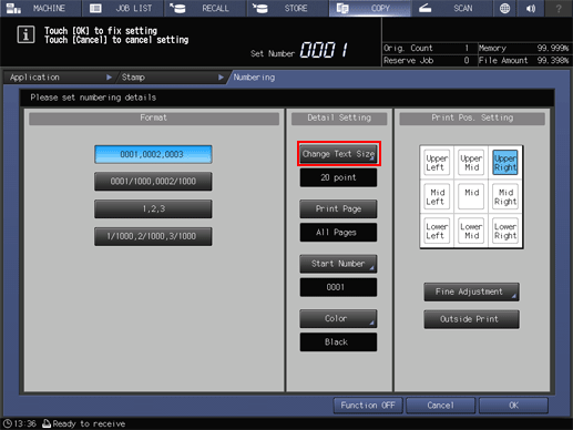 supplementary explanationFor details about Fine Adjustment and Change Text Size, refer to Making fine adjustment on printing position, and Changing the text size for numbering.