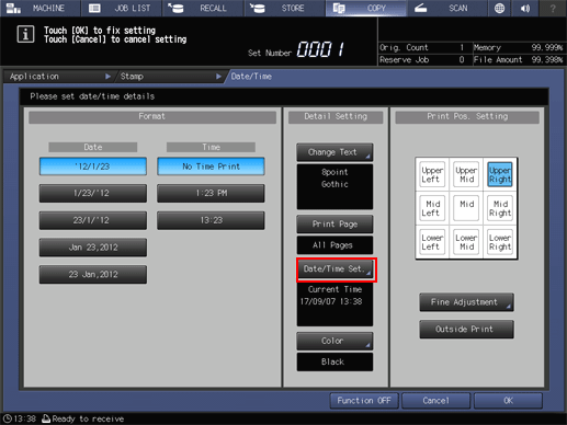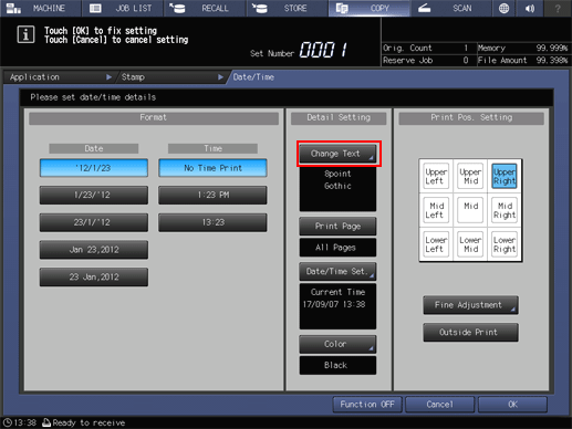 For Date/Time, set Format, Detail Setting (Change Text, Print Page, Date/Time Setting, and Color), and Print Pos. Setting.