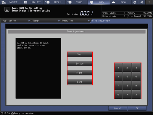 Make fine adjustments for the printing position of Numbering, Page No., Date/Time, and Annotation. Fine Adjustment is provided in the screen for each function. Pressing Fine Adjustment displays the following screen. The adjustment range is 0 to 1.96 inches (0 to 50 mm), in lengthwise direction (Top or Bottom) and in widthwise direction (Right or Left).
