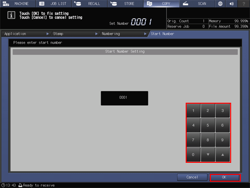 Use the keypad or down / up on the screen to enter the desired start number (up to four digits).