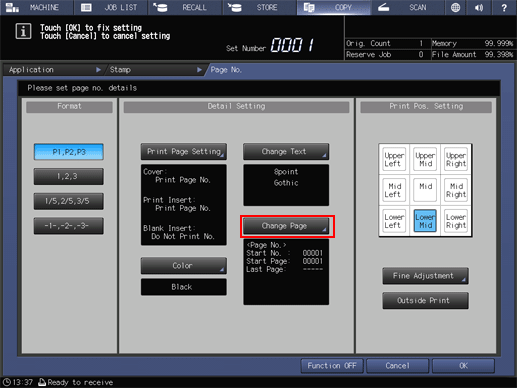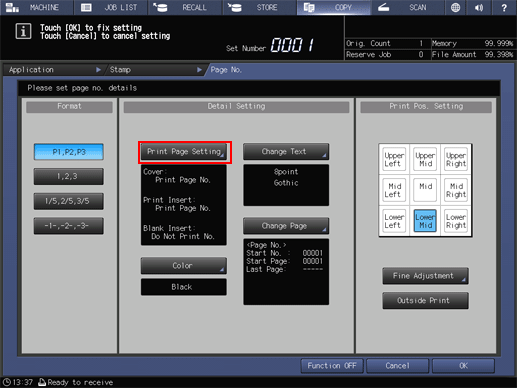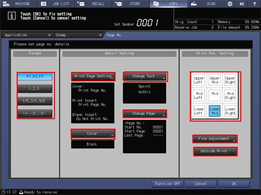 Print Pos. Setting | Select one of the 9 printing positions provided under Print Pos. Setting. If fine adjustment is desired, press Fine Adjustment. Press Outside Print to print numbering on the outside edges of facing pages. |