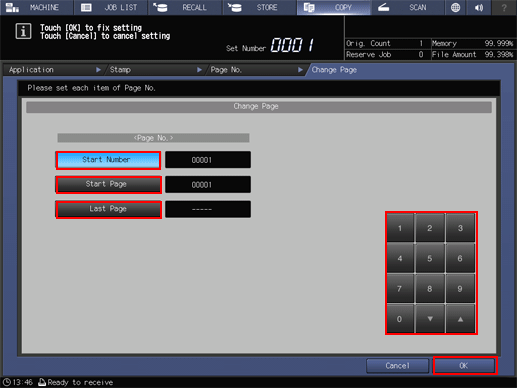 supplementary explanationUse the keypad or down / up on the screen to enter the start number in the range from 1 to 99999. To print on all pages, enter 0 to display ----- (no setting).