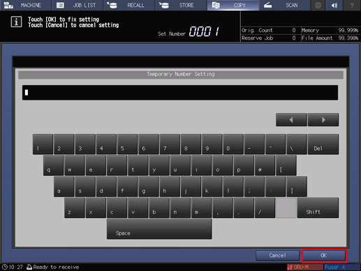 supplementary explanationPress the screen keys to enter a desired number for the temporary number. Up to 12 one-byte characters can be entered. With this setting specified, the annotation number will not be counted in the former setting. The entered temporary number will be printed on all pages.