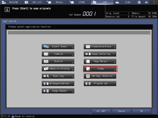 The Stamp icon and shortcut key are displayed under Application on the COPY screen.